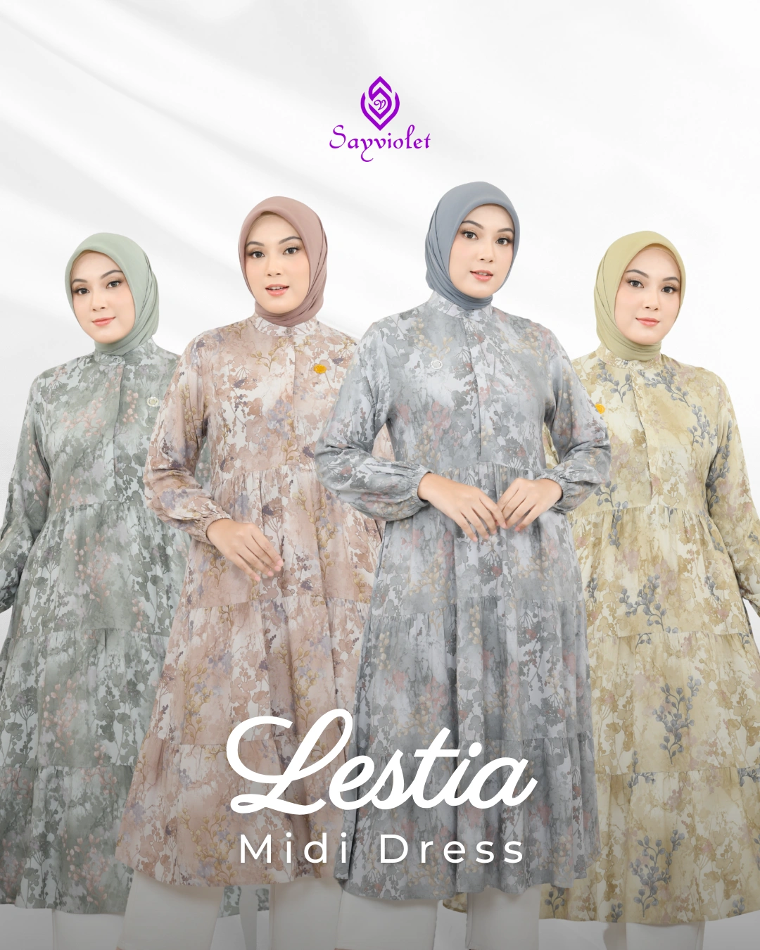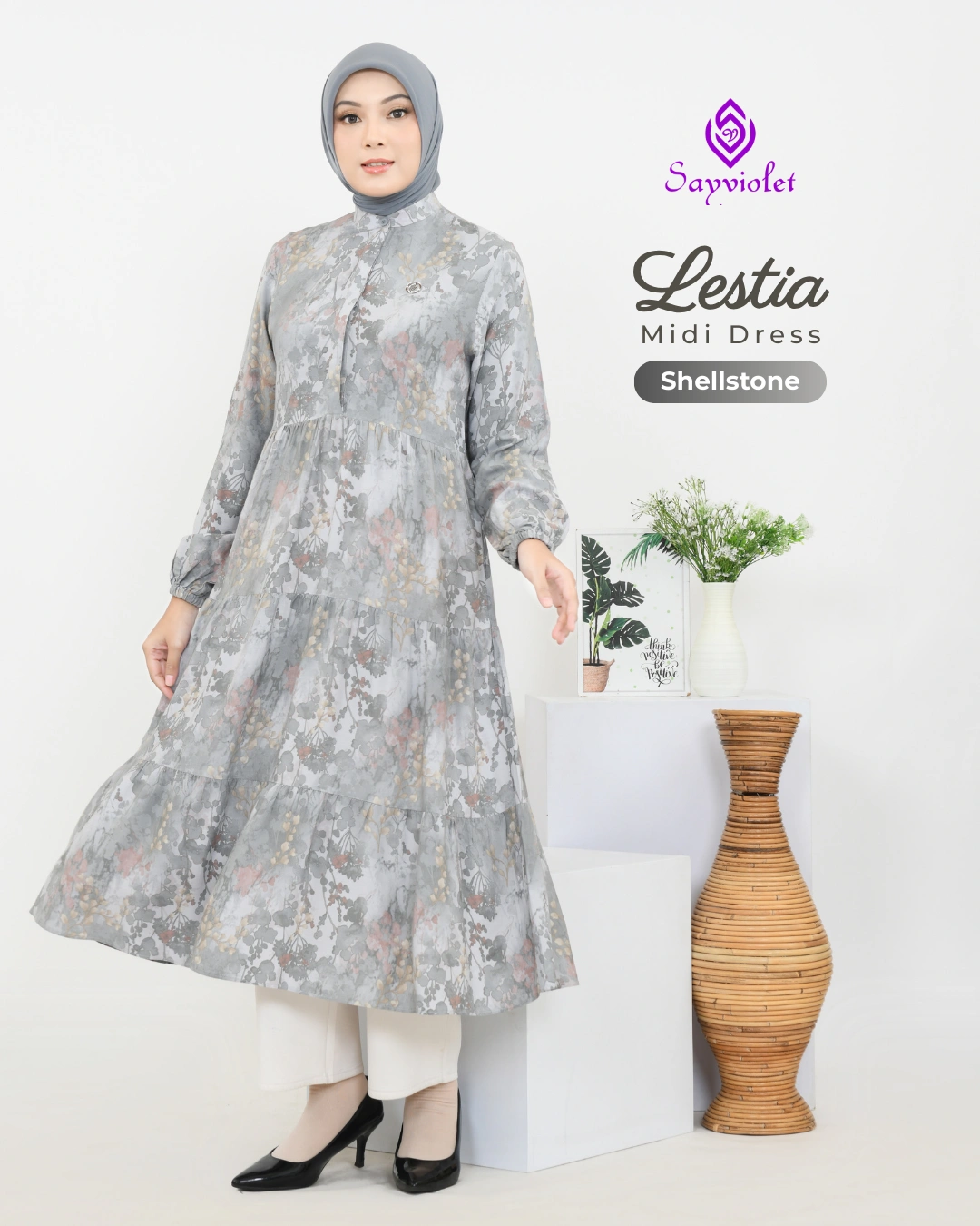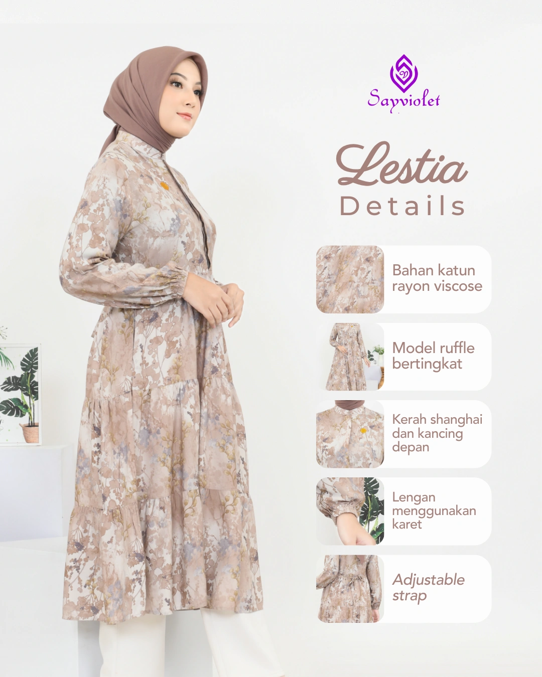 – Model ruffle bertingkat, memberikan efek flowy dan menyamarkan bentuk tubuh.
